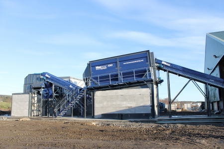 The new plant consists of a 6m feederwith incline belt taking the material to a BlueMAC 25-70 trommel. The robust trommel with maintenance friendly design is 7m long with a 2.5m drum. From the trommel, 40mm minus fine material is removed to reduce the volume of the waste stream and make for easier sorting. The oversize material then travels from the trommelto a 90 degree change of direction at which point the material passes an air separator which removes the light fractions. The remaining oversize material then enters the sorting cabin with its 5 double sided bays for the safe removal of recyclables. For operative’s safety, the cabin is fitted with industrial standard fittings such as lighting, heaters, windows and emergency stop cords. Once all recyclables have been removed the remaining waste passes a magnet for the safe removal of ferrous metals prior to the left over hard core to be stockpiled in the end bay.