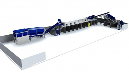 The BlueMAC MRF begins with a variable speed belt feeder steadily conveying the incoming waste stream into a 2510 trommel, which removes fines at 50mm and which are then transferred on a 50 metres long transfer conveyor to the fines clean up system at the other end of the building; en route the fines pass an overband magnet which removes any ferrous metals. The material is transferred into the fines processing system by a conveyor fitted with a magnetic head roller for smaller ferrous metal extraction which is collected via a chute into a skip. The remaining material passes over a flip-flow screen for processing of fines to -10mm. The 10-50mm is then segregated through a GK air classifier for heavy and lights separation, the light fraction being ideally suited to the production of SRF (solid recovered fuel)